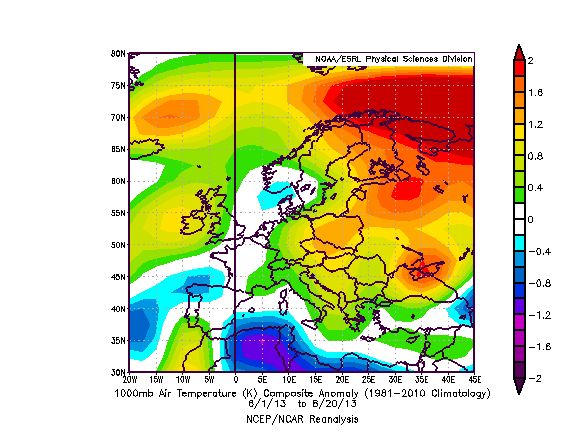 Anomalie standardizzate della temperatura dell'estate 2013 nell'emisfero boreale fra 20-90N Laddove i pixel sono < 1 si è verificata l'estate più calda dal 1948 ⇒ 4.1% della superficie Laddove i pixel sono > 65 c'è stata l'estate più fredda dal 1948 ⇒ 0.16% della superficie In ben il 20.6% della superficie l'estate è stata entro le 5 più calde In solo lo 0.64% della superficie l'estate è stata entro le 5 più fredde |